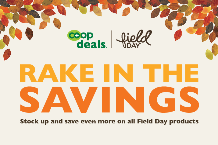 Now through Dec. 3, save big on all Field Day products! Just look for the cute little purple circle that says “Co-op Basics” and save. Tons of products in all stores.